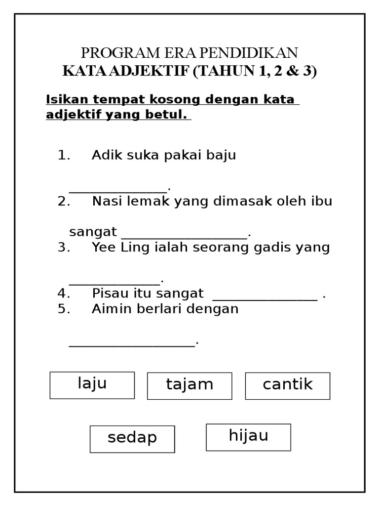bm kata adjektif tatabahasa bahasa melayu sekolah rendah tahun 1 2 3 4 5 6. Kata adjektif bentuk warna dan ukuran. Video ini adalah salah satu komponen pembelajaran learning port interactive. Before downloading you can preview any song by mouse over the play button and click play or click to. Ia menunjukkan bagaimana / yang mana. Tahun kemarin memang banyak rintangan yang menghadang. Kata adjektif (deria rasa) bulmaca. Abang bok yu _berbahasa jepun kerana dia pernah menuntut di jepun selama lima tahun. Saya membeli beberapa kuntum bunga. Kata adjektif boleh dibahagikan kepada sembilan. Kata adjektif online worksheet for tahun 4. Kata adjektif boleh disertai kata keterangan amat, paling, sangat, dan sebagainya yang bertugas sebagai penguat. Kata adjektif, juga dikenali sebagai kata sifat, ialah kata yang menjadi inti dalam frasa adjektif seperti manis sekali, sudah lama sungguh, masih lebat lagi.
